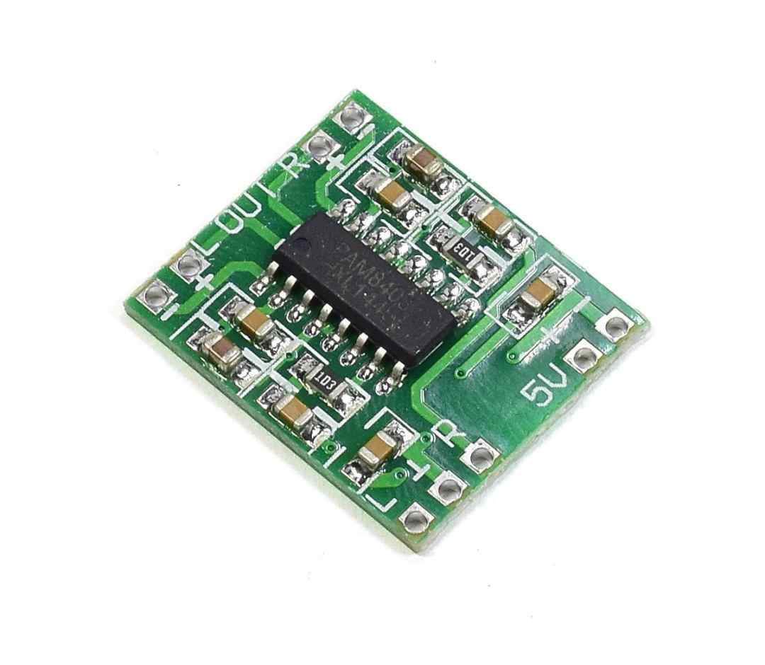 El modulo PAM8403 es un amplificador de audio dual de 3W por cada una de sus salidas, correspondientes a los parlantes derecho e izquierdo,este amplificador es de clase D. Ofrece baja THD + N, lo que le permite lograr una reproducción de sonido de alta calidad.
