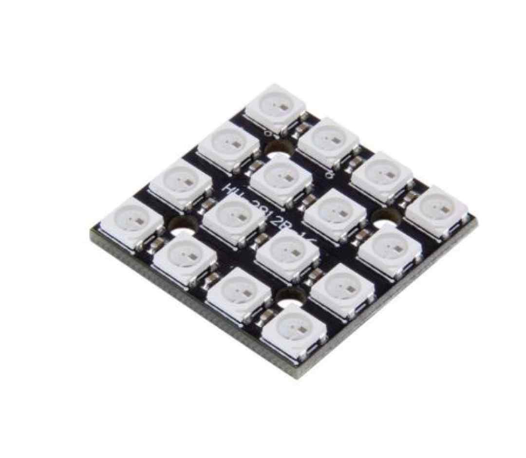 En esta matriz de 16 pixeles puedes controlar individualmente el color y la intensidad de cada uno de los pixeles, además puedes colocarlos en serie para un mayor tamaño. Todo usando un solo pin para el bus de datos.
